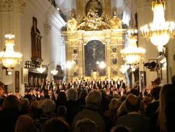 また夜8時からはショパンの心像が安置されている聖十字架教会にて、命日のミサが行われ、モーツァルトのレクイエムが演奏されました。教会内には溢れんばかりの聴衆が集まり、ショパンのレリーフがある柱を見つめながら、天井を仰ぎながら、そっと涙しながら、それぞれが静かに耳を傾けていました。(第二次世界大戦中、ドイツ軍によるワルシャワ爆撃直前にショパンの心臓はワルシャワ近郊へ移され、難を逃れました。その秘話はこちらへ)