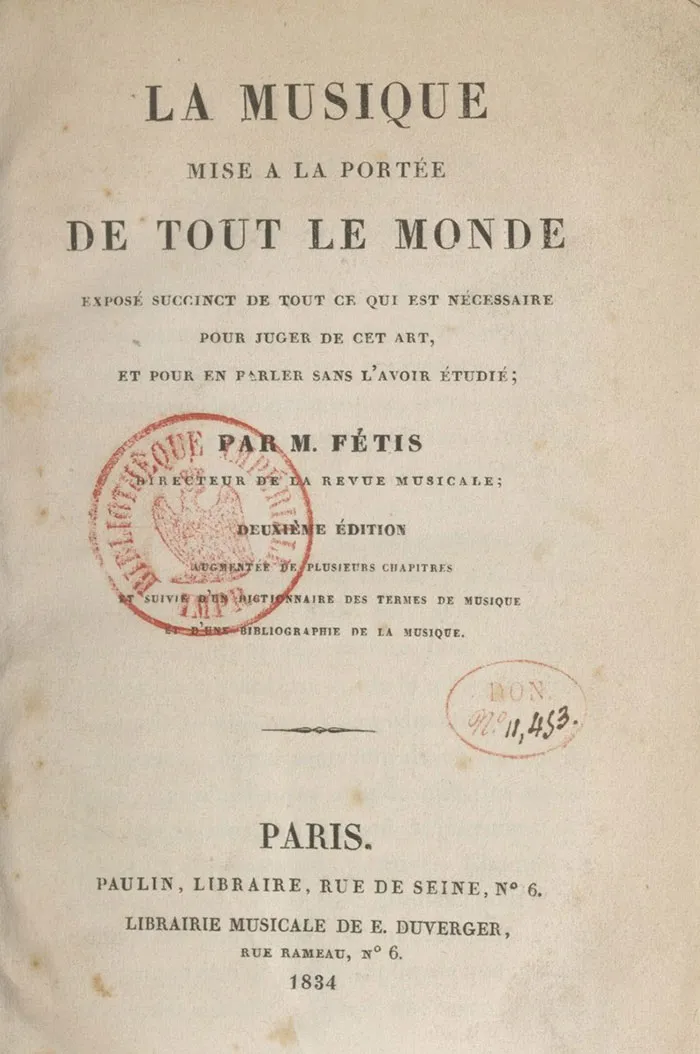 [^1]: François-Joseph Fétis, La musique mise à la portée de tout le monde, exposé succinct de tout ce qui est nécessaire pour juger de cet art, et pour en parler sans l'avoir étudié. Paris, Alexandre Mesnier, 1830.