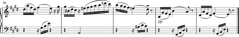 これらの曲集に収められたクラヴィーア・ソナタは計18曲あります。1750〜1770年代に出版していた愛好家向けの作品よりも、技巧的にも華やかさが増しているほか、聴き手の予想を裏切るイレギュラーな終止がいくつか登場するなど、興味深いポイントが多くあります。例えば、第5集の〈ソナタ第1番 ホ短調〉H.281, Wq.59/1(1784年作曲)第3楽章の最後(【譜例2】の第59~60小節)では、完全終止ではなく、属七の和音の第2転回形・主和音の第1転回形が現れるのみで、ppで消えていくように曲が終わっています。 C.Ph.E.バッハ:《専門家と愛好者のためのクラヴィーア曲集》第5集より〈ソナタ第1番 ホ短調〉H.281, Wq.59/1(1784年作曲)第3楽章 アンダンティーノ 第56~60小節