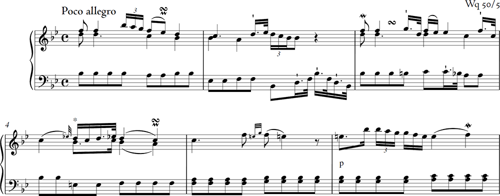 C.Ph.E.バッハ:《変奏反復付きソナタ集》より〈第5番 変ロ長調〉 H.126, Wq.50/5(1758年作曲)第1楽章 ポコ・アレグロ 第1~6小節