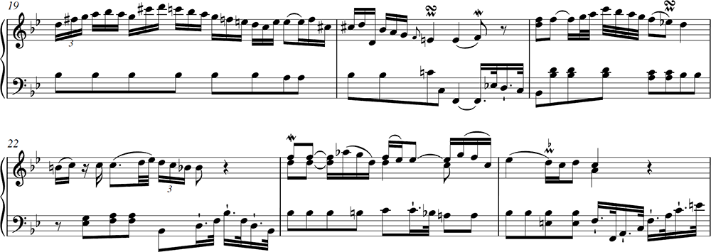 C.Ph.E.バッハは楽譜出版業にも力を入れ、『正しいクラヴィーア奏法に関する試論』第1部(1753年出版)とともに出版された《プローベシュテュッケ》Wq.63(1753年出版)、《変奏反復付きソナタ集》Wq.50(1760年出版)、《6つのやさしいクラヴィーア・ソナタ》Wq.53(1766年出版)、《婦人達のための6つのクラヴサン・ソナタ》Wq.54(1770年出版)といった、初心者や音楽愛好家向けの教育的な作品集を立て続けに世に出しました。なかでも、C.Ph.E.バッハの変奏反復付きソナタ※脚注1は、当時の演奏習慣を窺い知れるものであると同時に、J.ハイドン(1732~1809)らの創作にも影響を与えた、音楽史的にも重要な「発明」でした。というのも、楽譜上で反復記号がついていて、同じ部分を2回弾くように指示されている場合、即興的に装飾を加えて反復演奏する慣習は当時からありましたが、初心者にとっては、適切な装飾をみずから考えて演奏するのは至難の業です。変奏反復付きソナタでは、その反復部分が、反復記号で省略されずに、装飾を加えた形で書き出されています。それにより、初心者でも、記譜通りに弾くだけで、作品の本質を損なわない趣味の良い装飾で演奏することができます。《変奏反復付きソナタ集》より〈第5番 変ロ長調〉 H.126, Wq.50/5(1758年作曲) 第1楽章(【譜例1】)を例に見てみましょう。第1~20小節が楽章前半で、第21小節からはその反復部分が、装飾された形で書き出されています。第1~4小節に対応する第21~24小節では、元の骨組みはそのままに旋律が装飾されており、伴奏型にも、生き生きした付点リズムの装飾が加えられています(第24小節)。