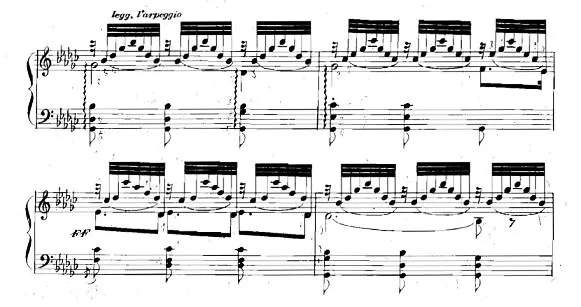 《マイアベーア「悪魔ロベール」による左手のための幻想曲》作品106の一節。分散和音の中に、メロディーラインを巧みに組み込む書法はジギスムント・タールベルクによって推し進められたが、アドルフォ・フマガッリはこれを左手だけで実現しようとした。