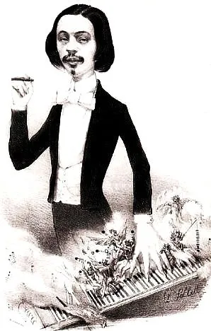 この比類ない演奏技術とオペラの歌唱性を生かした彼の演奏によって、彼はベルギーで「ピアノのパガニーニ」という異名を勝ち得ました。この項目冒頭のカリカチュアは、彼の悪魔的な左手を戯画化しています。