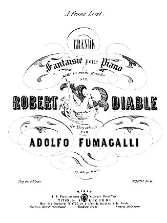 《マイアベーア「悪魔ロベール」による左手のための幻想曲》作品106の表紙(ミラノ、リコルディ社、1855)。リストに献呈。