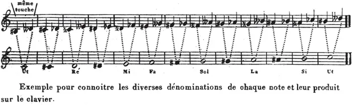 アダンの『メソッド』(1804)より。記譜上は名前の違う音でも、鍵盤上では同じ音であることを解説している。