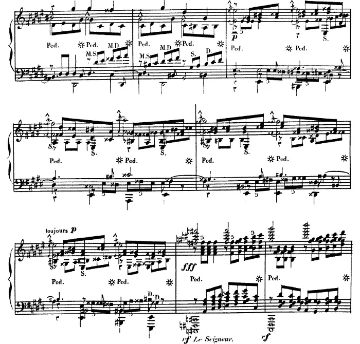 一見シャープとダブルシャープの大洪水ですが、整理すれば「シャープ7つ+ダブルシャープ3つ」の調号で読むことができ、システマティックに書かれています。最後の段に「Le Seigneur」という表示が見えますがこれは「主たる神」を意味します。「ファウストのように」という表題によって示唆された一連の音楽的叙述の中で、このフーガは神の救済、魂の浄化など、神聖なイメージを喚起させるプロセスに位置づけられます。このイメージを際立てているのは、より上位の♯系の調への転調です。ここでは音楽理論上の調的「上昇」が巧みに音楽の物語的な足取りと結び付けられているのですが、とりわけ通常では使用されない「嬰イ長調」を使用することで、世俗性(=使用頻度の高い調性)からの乖離が際立てられています。ここで印刷会社の手間を考えて「嬰イ長調」ではなく変ロ長調を使うと、せっかくのコンセプトが台無しです。