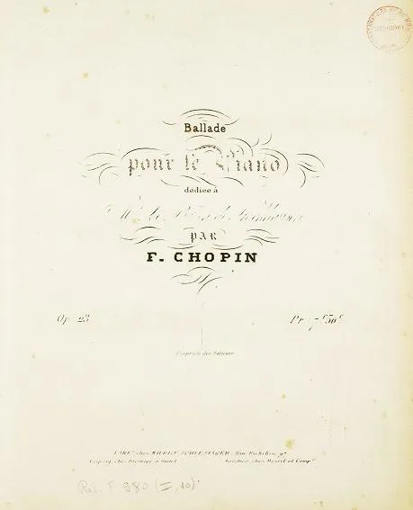 シュレジンガー社から出版されたショパンの《バラード》作品23(第一番)、初版表紙。飾り気のない簡素なデザインはシュレジンガー社の表紙の特徴。