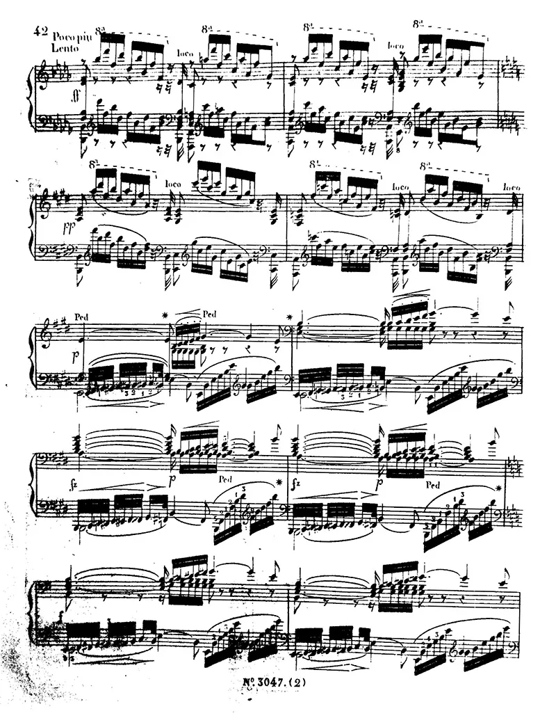 第19番「アンダンテ」より。ショパンやリストら若い1810年世代は1830年代に数々の練習曲を書いたが、その傍らでベルティーニは華々しさよりも内向的で伸びやかな旋律を追究した。上の譜例は歌唱的な主題につづくシンフォニックな展開部分。