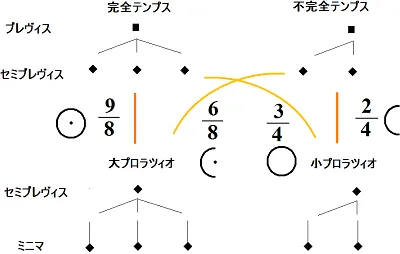 さあ、だんだん話がややこしくなってきましたが、あと一息です。このうち、いまは最後の3と4、すなわちテンプスとプロラツィオだけに注目してください。完全/不完全テンプスと大/小プロラツィオという4つの関係を互いに組み合わせると、面白いことに、現代の拍子にも対応する4つの拍子が導き出されます。図5と対応させながら説明をご覧ください。