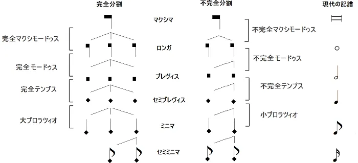 b 不完全モードゥス:ロンガとブレヴィスの不完全分割関係a 完全テンプス:ブレヴィスとセミブレヴィスの完全分割関係