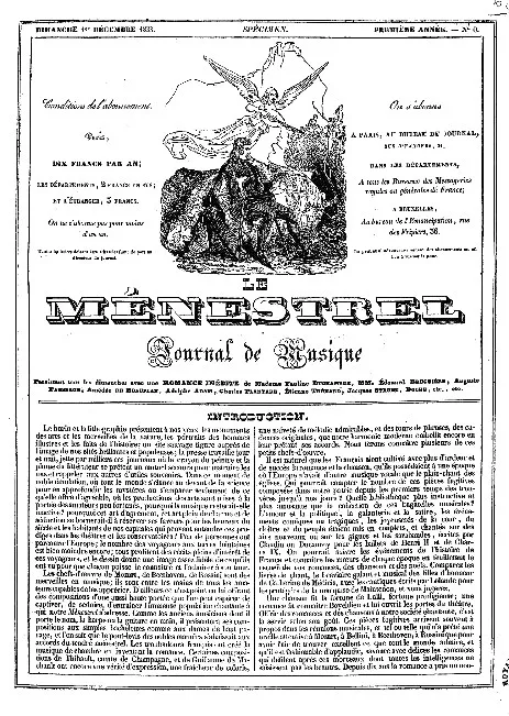 図1 『ル・メネストレル』紙創刊号の表紙。「メネストレル」とは表紙の絵に示されているように、中世の吟遊詩人。ネーミングは19世紀前半に流行した中世趣味を反映したものと思われます。