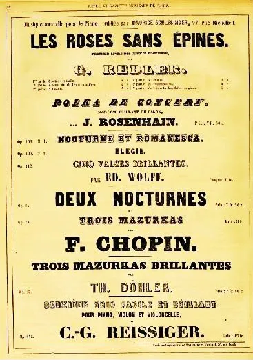 図2 『ルヴュ・エ・ガゼット・ミュジカール』紙に掲載されたショパン作品の広告(1845/6/1)。《2つのノクターン》作品55、《3つのマズルカ》作品56。その上にはショパンと同郷の作曲家エドゥアール・ヴォルフ、下にはイタリア出身のドイツ人作曲家テオドール・デーラーの作品が掲載されている