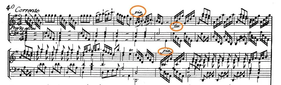 初版の楽譜からソナタ第7番 Correnteの冒頭。ピアノ、フォルテを表す「pia」,「for」の表示が見られます。