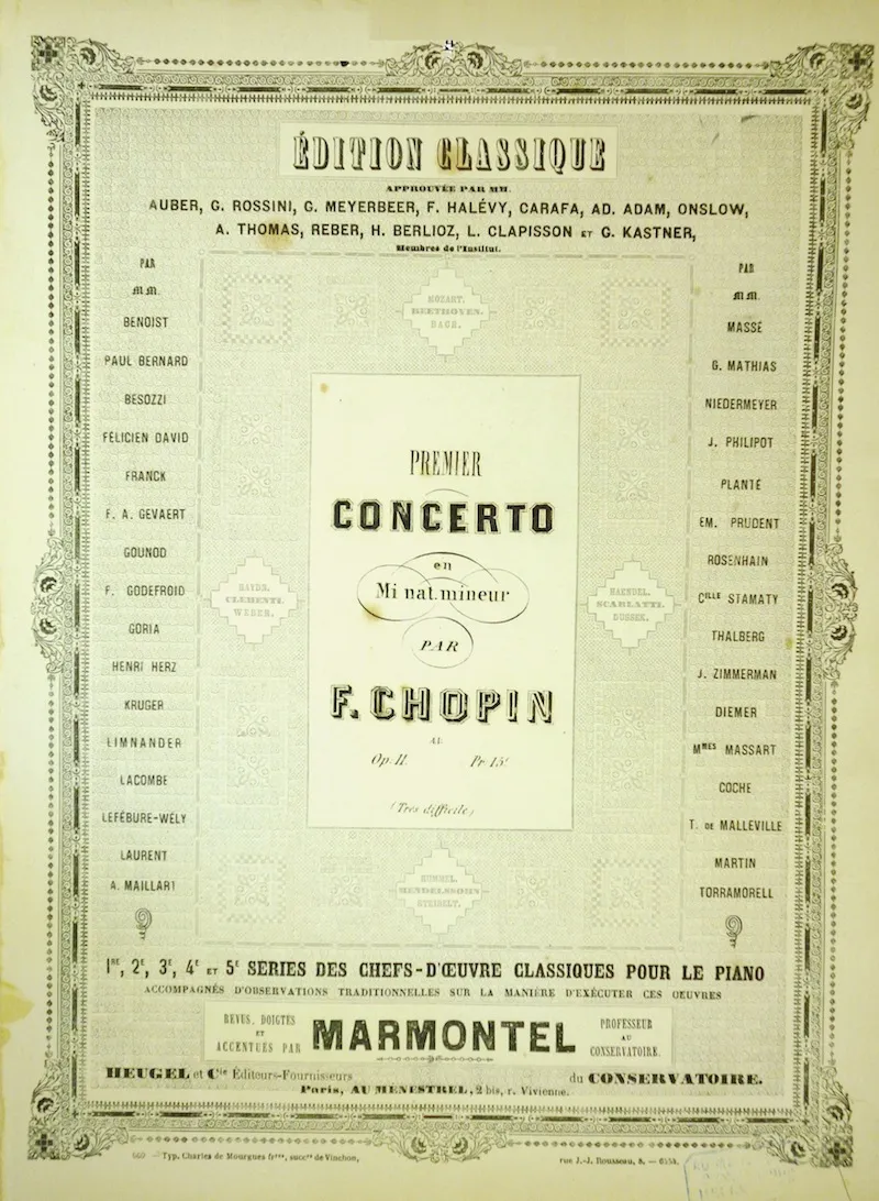 図1 マルモンテルが編集したショパンの《ピアノ協奏曲》第一番の表紙。マルモンテル版の楽譜は「規範的エディション」として売り出され、1864年のパリ万博の教材部門ではメダルを獲得した。表紙上では名だたる音楽家たちが推薦者として名を連ねている。