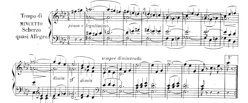 ドゥシーク『パリへの帰還』(1807)より第3楽章、「メヌエットのテンポで、スケルツォ、殆どアレグロのように」の冒頭。変イ長調でありながら嬰ヘ短調の素振りを見せる冒頭は、当時の玄人たちを驚かせたことでしょう。