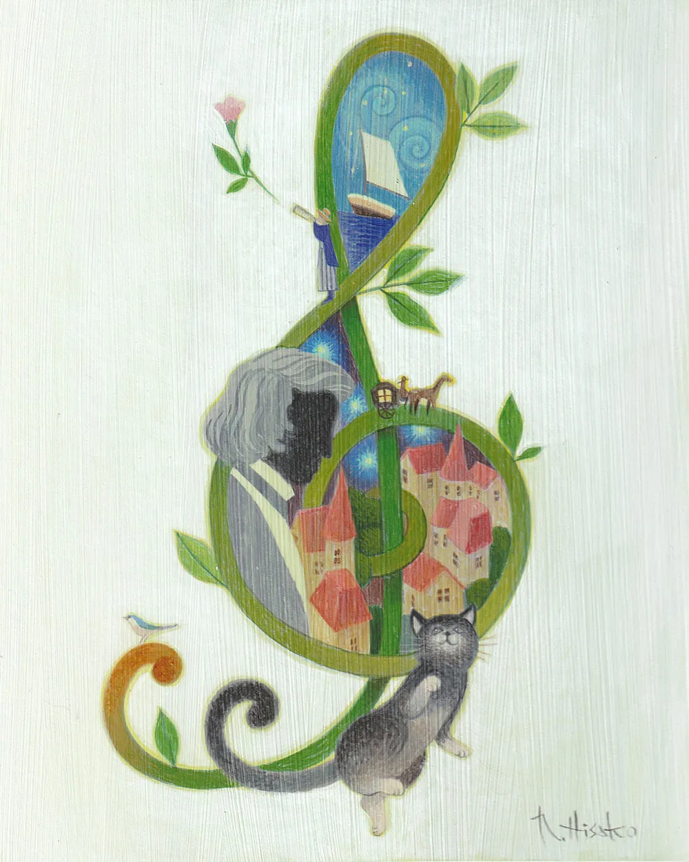 19世紀の音楽家・チェルニー氏から贈られたモチーフを活かし、鍵一が作曲するオリジナル曲。19世紀の旅で出会った芸術家たちの肖像画を、変奏曲の形式で表した作品です。 実際には、作曲家の神山奈々さんが制作くださり、ピアニストの片山柊さんが初演をつとめて下さいます。オーディオドラマやコンサート等でお聴きいただけるよう、現在準備中です。 神山 奈々さん(作曲家) 片山 柊さん(ピアニスト)鍵一がチェルニー先生から『夢の浮橋』の楽譜の一節を贈られたエピソード