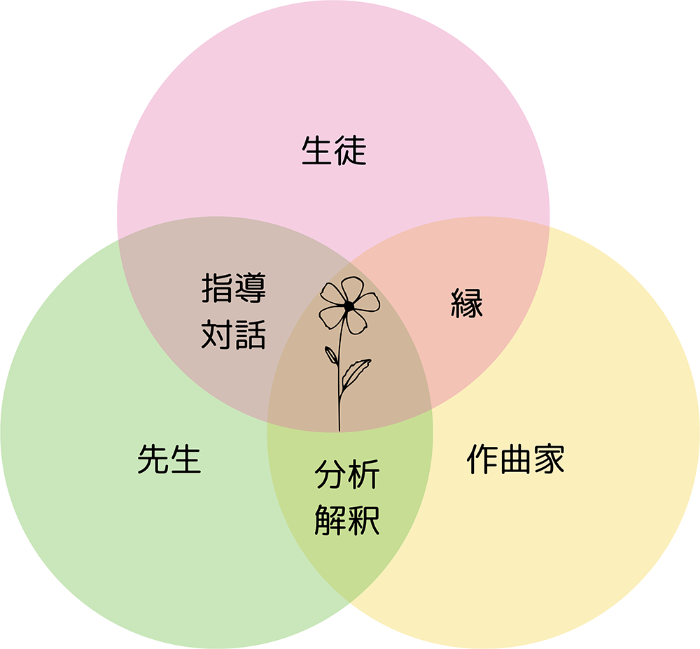 そこでは、演奏者(=生徒)にはプロの手助けが必要です。私は、「作曲家 × 演奏者」に「指導者」が加わる「三者の交流」こそが、教育の場における音楽の源だと考えています(図を参照)。大好きな自分の先生の助けを借りながら、生徒が主体となって作曲家と時空をも超えて対話する。その架け橋こそが指導者です。言い換えれば、教育現場において、楽譜に込めた「作曲家の言葉」を通訳してくださるのは先生方であり、また生徒と作曲家の縁をつないでくださるのもまた、先生であることが多いことと思います。