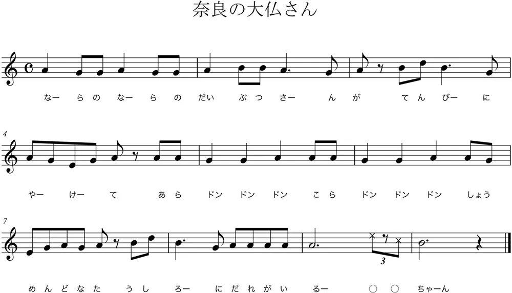 「ムジカ・ナラ」について、さらに詳しく具体的な解釈等をお聞かせいただけますか?1つめの鐘の音B♭の音は、伸ばしながら倍音のDを聴いてください。すると次の2小節目で本当にDが鳴るのです。4小節目からは、童歌「奈良の大仏さん」の断片が聞こえてきます。7小節目は、童歌らしく「レードドレー」の下がった「ド」を大切に弾いてください。