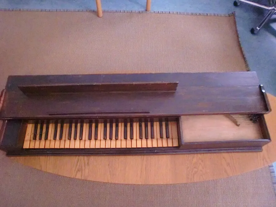 長方形の箱型クラヴィコードで、その簡素な作りから以前はオルガニストの練習に使われていた楽器と推定されている。蓋は2つの木版 を合わせてできており、完全に閉めない状態で、片方の木板が譜面台として使えるようになっている。