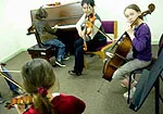 そのお話をいくつかのシーンに分け、グループに分かれて担当するシーンのお話を表す音楽を作ることに。洞窟から脱出するシーンを担当したグループでは、弦楽器の子が「だんだんよじ登っていくけれど失敗して落ちてまたトライするのを、指をすべらせて上がったり下がったりするのはどう?」と提案すると、それにあわせてピアノの子が高音から低音へ音をジャンプさせたりと色々と実験。別のグループでは、「身動きが取れなくなった時の不安なメロディに、ドキドキした鼓動みたいな音を少しずつ早くしてつけてみるのは?」「それいいね!この音でどう?」とアイディアを出し合っている。