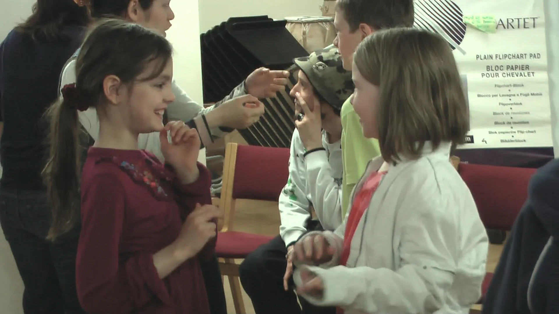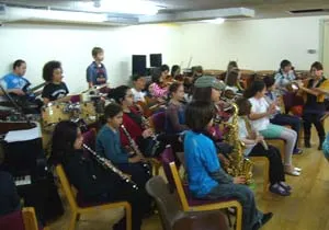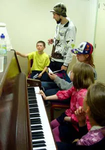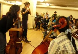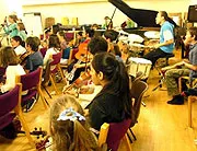『World In Motion』に参加した子たちは『Urban Sounds』よりも少し年齢が若く、日本でいう小・中学生が対象。ヴァイオリン5、フルート4、チェロ4、ヴィオラ1、ドラム2、クラシックギター2、クラリネット4、サックス2、パーカッション1、ピアノ3、ヴォーカル3という、約30名の子どもと3人の学生が集う、大アンサンブルとなった。この年齢の子どもたちは1人1人のエネルギーが大きく、また1歳ごとの身体や精神年齢の違い、個々の音楽経験や能力の違いも大きい。このような年齢の大人数の子どもたちを相手に、どのように全体をまとめ、一つの音楽を作り上げるのだろうか。