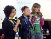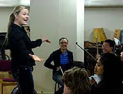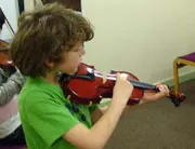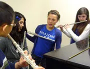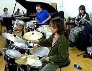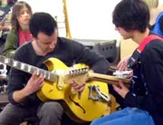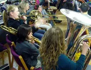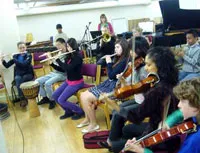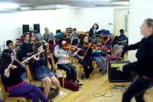 今回の4日間のアクティビティには、9歳から17歳までの約20名の若者と、9名のギルドホールの学生が参加し、約30名のアンサンブルが出来上がった。編成は大まかに、ヴァイオリン4、フルート4、ピアノ1、ドラム2、ベース1、エレキギター5、パーカッション2、マリンバ1、ホルン1、サックス1、トランペット1、チューバ1、トロンボーン1、ヴォーカル2、コンピュータ音楽1というもの。「ピアノも弾けるけど今回はフルートで参加するの」という女の子や、最初は太鼓だったけれど途中で「ぼくもトランペットが吹きたくなった」という男の子、音楽の流れにあわせて途中で楽器をベースからマリンバに、フルートやギターからヴォーカルに、と柔軟に楽器を変えるなど、固定した編成にとらわれない、まさにその時だけのアンサンブルだ。