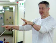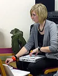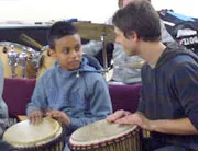 「アーバン・サウンド」のリーダーは、ポールとシグルンの2人。2人ともギルドホール音楽院のコースを経てここを中心に国内外でワークショップ・リーダーとして活躍してポールは22年、シグルンは11年というベテランだ。ロックやジャズの分野で現在もバンド活動をするポールはギターを肩に、トロンボーンを学んだシグルンは他にも太鼓やピアノや歌を駆使しながら、アンサンブルをリードしていく。