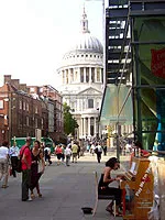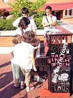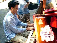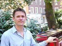 これらのピアノはどこから来たのだろうか?30台ものピアノを設置するとなると、コストもかかるはずだ。「このピアノは、ピアノの運搬会社の協力を得て譲ってもらったものなんだよ。そこに集まってきた廃棄用のピアノを壊してしまわずに、町の中に持って来てデコレーションしたんだ。だから、ピアノ代はただ。かかっているのは、運搬費と調律費だけで、それは今回はシティ・オブ・ロンドン・フェスティバルの一環として持ってもらっているんだ。」なるほど、廃棄ピアノもかわいくペイントしてしまえば、お金をかけずに町の中でのシンボル的存在になる。試しにピアノを弾いてみると、確かに調律でどうにもならないくらい、音が出ない鍵盤や一度押すと戻ってこない鍵盤、機能しないペダル...という状態。それでも皆おかまいなしに楽しんで弾いている。むしろ、「このキー、戻ってこないんだよ!」なんていうのも、会話の一つになっている。