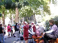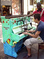 曲の合間に、傍らで聴いていた人が話しかける。リクエストをしたのだろうか、また別の曲を弾き始めた。「君も弾くかい?」とピアノを譲ると、今度は別の人がビートルズの弾き語りを始めた。公園の横を通り過ぎようとしていた人も中へと足を向け、立ち止まり、一緒に歌いだす。と思うと、大道芸人のような衣装を着たミュージシャンたちが出てきて、周りの人を巻き込んでピアノと歌のショーをやり出した。30分座っているだけでも、1つのピアノの周りを色々な人と音楽が巡っていく。