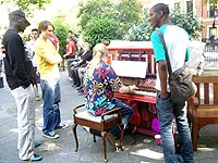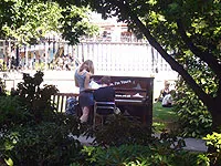 ある晴れた日に早速ピアノを探しにロンドンの街へ出かけた。まず最初に目指したのはソーホー・スクエア。ロンドンの街の中心部にあり、ショッピング街やレストラン、カフェ、シアター街などに囲まれたエリアにあるちょっとした公園で、ロンドナーの憩いの場だ。ピアノはどこだろう?と思いつつ足を踏み入れてみると、木陰の方から音が聴こえてきた。
