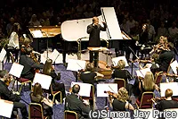 数小節たったところで「こうやって2人で並んで弾いていると狭いでしょう、おやおや、この2人も大変なようだよ...?」と言うと、連弾の2人はお互いに押し合い、手の場所やペダルを取りあう。「ピアノの連弾のリハーサルって大変なの、わかるだろう?」と笑いを誘う。「今日はこのピアノ連弾曲を、オーケストラでやるんだ。どんな感じかな?」と、今日のオケ、ブリテン・シンフォニアから応援にかけつけたフルートとクラリネットの奏者が同じ部分を演奏し、聴きくらべ。