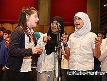 4回のセッションが過ぎると、だいたいの歌詞とメロディが出来上がった。マイクが「前回までに作った歌を覚えてる?誰か教えて。」と言うと、子どもたちは先を争って手を挙げる。「おなかがすごくすいたな」と1つ目の歌詞をある子が言い、「次は?」と当てていくと次々に歌詞が出て来る。忘れかけていた歌詞も、みなの記憶力をあわせるとちゃんと完成する。今度はコンサートに向けて歌詞に振付をつけることに。「熱くてやわらかいサモサ」は手をサモサの形の三角に、「辛いチキンウィング」は鶏の羽のように腕をパタパタするなど、子どもたちは喜んでアイディアを出す。振付は、次の歌詞を忘れた時ジェスチャーで思い出すのに役立つ。複雑なリズムのメロディをあわせて歌えるように、休符のところに手拍子を入れるなど、覚えやすく、かつ楽しく歌えるよう工夫する。