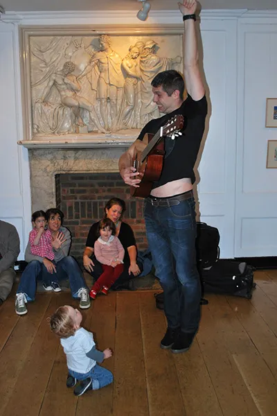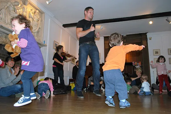 もう7年ほど前、私の息子が1歳になる頃でした。NCT( National Childbirth Trust)という育児ネットワークの出産前クラスからの友達9人ほどと定期的に集まっていたのですが、その日たまたま雨が降っていたので、「私の家に来て何か楽しいことしましょうよ!」と言って、まさにこの部屋でピアノとヴァイオリンを弾いてあげたのが始まりです。