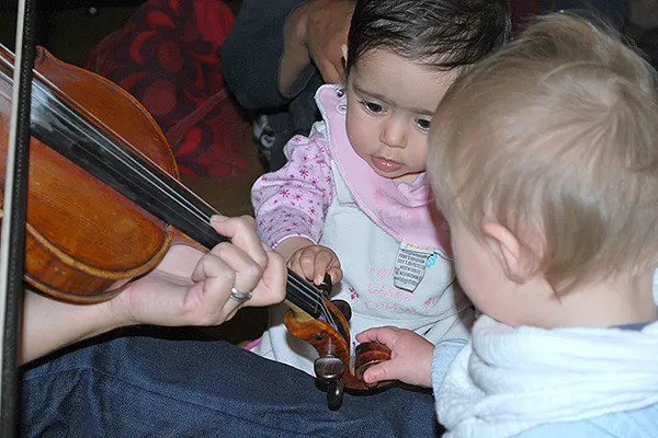 今は家の中でも外でも、音楽や音は巷にあふれています。ですから、子供は耳から入るもの全てを聞かないようにすることに、既に慣れています。また、家族に楽器を演奏する人がいなければ、子供にとって音楽というものは、壁のプラグにつながった箱から出てくるものでしかありません。赤ちゃんは、おもちゃを押したら動く、ボタンを押したら何かが起こる、というような遊びのやり取りを通して、物事の因果関係を学んでいきますが、壁につながれた箱から勝手に流れてくる音楽というのは、つじつまが合わないのです。それが、ミニ・モーツァルトに来てヴァイオリンを弓でこすって音を出したり、楽器を吹いて音を出すのを自分の目で見て、多くの子どもたちは「ああ、こうやって音楽は鳴るんだ」と初めて理解し、ようやく音楽の謎が解けるのです。生のミュージシャンを通じて音楽とインタラクティブに関わることは、意識的に「聴こう」と注目する姿勢を生み、聞こえるものと目の前で起こっていることを関係づけ、子供の認知的な発達を助けるのです。