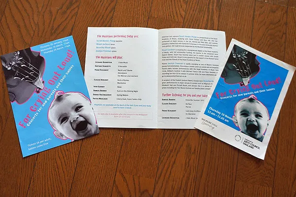「フォー・クライング・アウト・ラウド」は、生後12か月までの赤ちゃんを連れて行けるクラシックコンサートで、ウィグモアホールのメインホールで行われる。ネーミングは、英語表現で「まあ!」という驚きや、「お願いだから~してよ!」という時に使うfor crying out loud!を、文字通り、赤ちゃんが大声で泣くことをかけたのであろう。一流のコンサートホールでのコンサートだから、赤ちゃん連れでも静かにしていなければならないのかな?という不安も、このネーミングで「このコンサートは、赤ちゃんが泣いても、外に出なくてもいいのかな?」という期待に変わる。