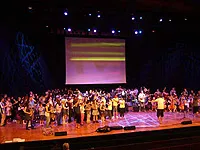 Each band had a rehearsal and checked their position on the stage, their entrance and exit line, and the volume and balance of the microphone for the soloist and the ensemble. They had a final fine-tune, because, since there were some new people who could not come at the weekend and perform the music together on the big stage, they still came up with new and better ideas. At the finale, there were over 200 musicians on stage, nearly twice as many as were present at the weekend. Almost half of them were hearing the music for the first time and making music together on the stage, so even the children or the leaders who created the music at the weekend felt that they were now creating new, exciting music that no one had never heard before. Every one of them showed the greatest concentration and paid attention to the leader while they were playing, because they never knew what would happen next till it ended. What an absorbing ability they had! They were unafraid to make changes for the better. Freshness, concentration, and the live aspect kept the ensemble attractive.