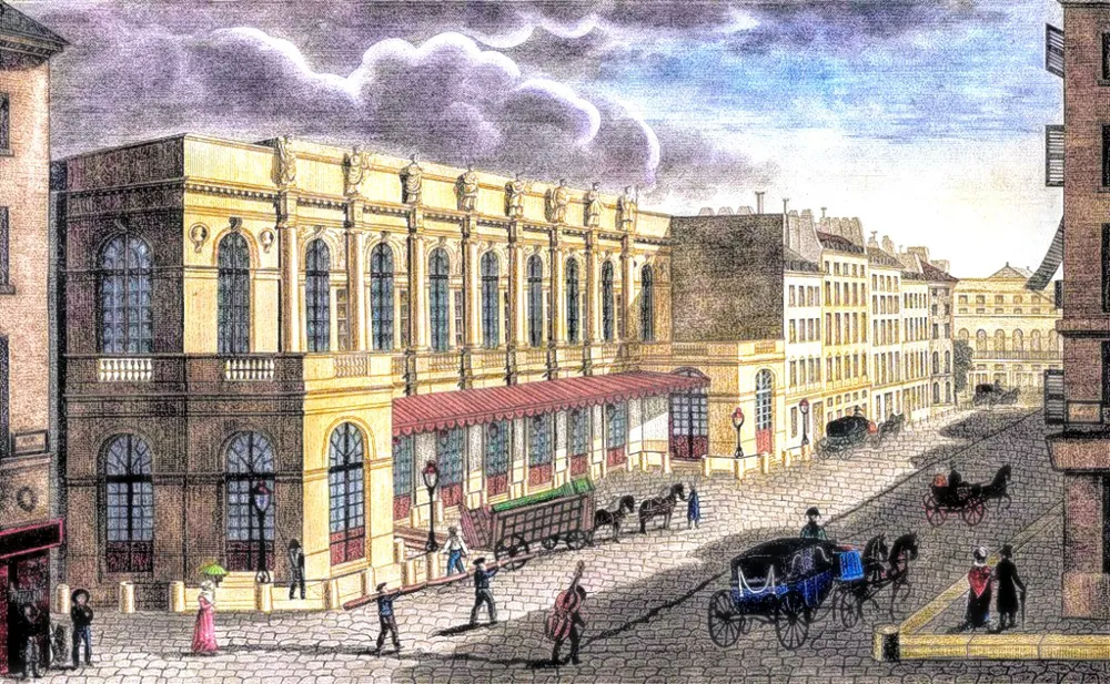 1820年2月、ルイ18世の甥、ベリー公が、当時のオペラ座本拠地、リシュリュー通りのSalle Montansierでの観劇後に暗殺。この事件をきっかけに、より安全性の高い立地へのオペラ座移転の必要が高まり、1821年8月、建築家のフランソワ・ドゥブレFrançois Debret(1777‐1850)設計による新しい歌劇場がル・プルティエ通りにオープン。当初は、本格的なオペラ座の建設地が正式に決定するまでの、仮のオペラハウスとして一時的に開場されたが、結果的には1873年10月、原因不明の火災で全焼するまで、52年に亘り、オペラやバレエの上演と共に、パリを代表する社交界の中心的スポットとして重要な役割を果たした。