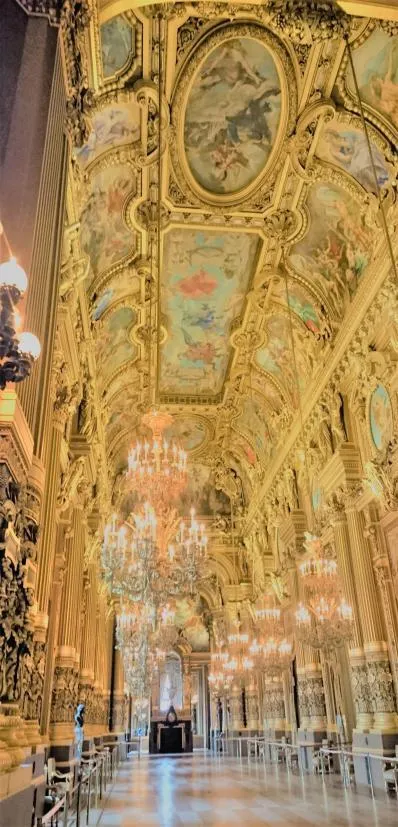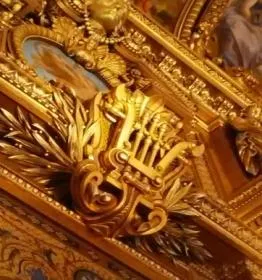 メインモチーフの竪琴が空間全体に統一感を与え、窓と鏡がさらなる空間を演出する。豪華絢爛なグラン・フォワイエ=大広間。高さ18m、幅13m、長さ154mの空間が、鏡と窓の効果でさらなる広がりを感じさせる。メインモチーフである竪琴が、全体の装飾に統一感を与える。