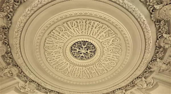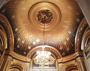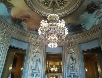 幕間にアイスクリームを供していた、明るく清々しい円形サロン。周囲はバッカスの巫女や牧神の装飾で彩られ、タピスリーには飲み物や釣り、狩の場面が描かれいる。オペラ座のオープン後に完成され、ベル・エポックの美学が集約されている。