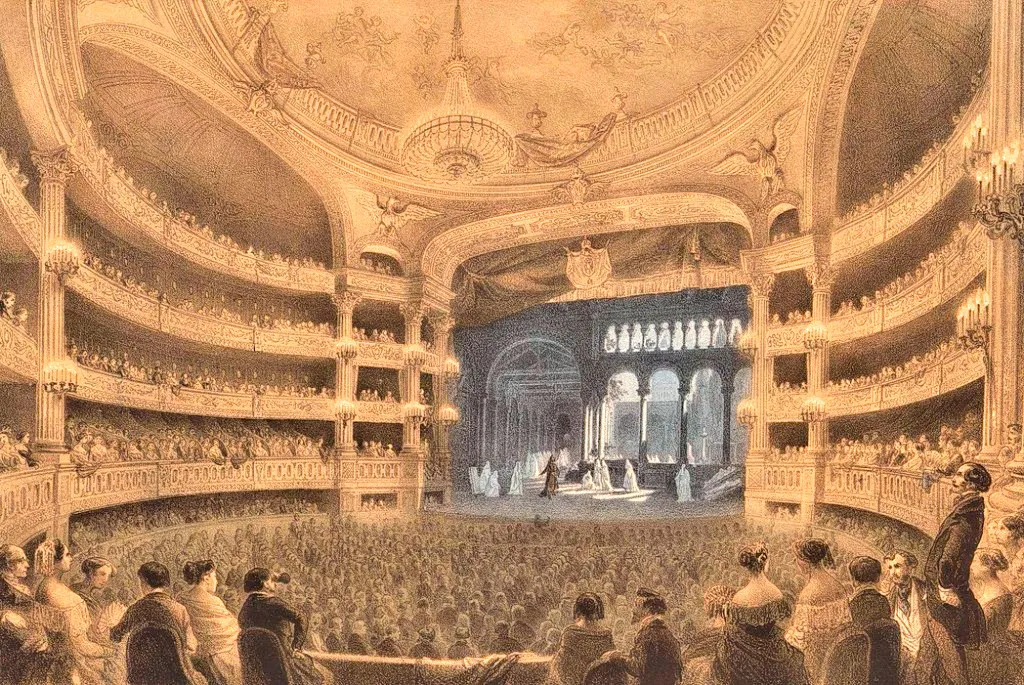 イタリア劇場内部~出演者への喝采~(1842)E.ラミによるリトグラフ