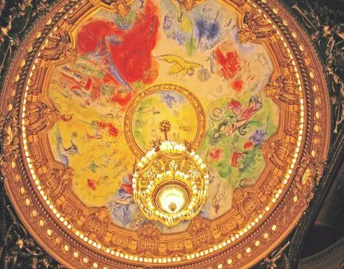 当時の文化大臣、アンドレ・マルローから委嘱されたシャガールの天井画は、フランスの画家Jules Eugene Lenepveu(ジュール・ウジェーヌ・ルヌヴー)によるオペラ座完成当時の天井画の上に貼り付けられ、1964年9月23日に除幕された。シャガールは5色に区分された各区画に、以下の14 名の作曲家によるオペラやバレエの場面を描き込み、さらにパリの代表的なモニュメントを散りばめ、19世紀の佇まいに20世紀の新しい風を導入することに成功した。