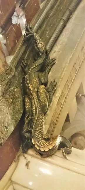 光のブーケを手にした2 体の女性像台座下の炎の蜥蜴(サラマンダー)