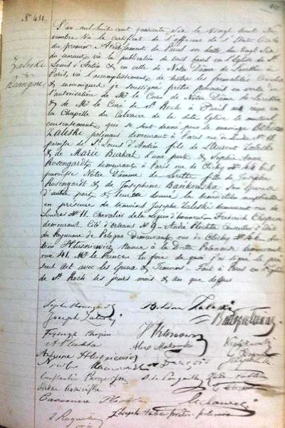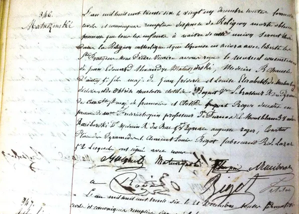 聖ロック教会に保管されている、1836年12月21日付け、ヤン・マトゥシンスキとクロチル ド・ボケ嬢の結婚証明書。立会人のひとりとして、ショパンおなじみの直筆サインが今も残る。
