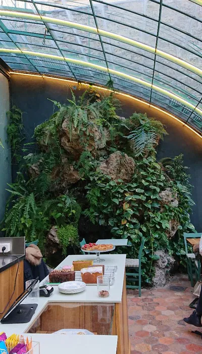 温室スタイルの店内や中庭で軽食やお茶、ケーキが楽しめる。