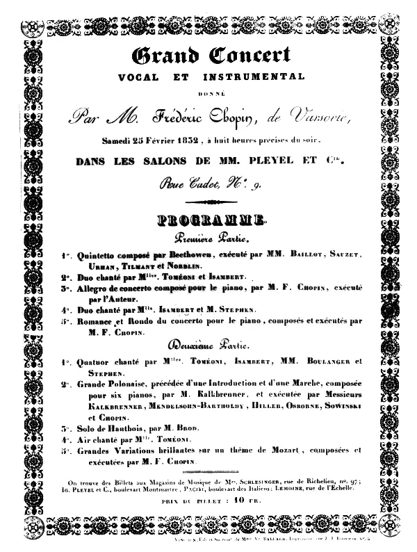 長きに亘り、プレイエル・サロンにおけるショパンのデビュー演奏会は、度重なる延期の結果、フェティスの批評記事によって1832年2月26日(日)に開催されたと考えられていたが、告知やポスター、来場者の日記や手紙などから、現在では1832年2月25日(土)と推定されている。 [