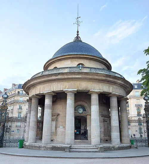 公園入口に立つ、16本の柱の柱廊に囲まれた古典的なドーリア式神殿の円形搭。かつてのパリは密輸防止のため城壁に囲まれ、所々に税金徴収所が設置されていた。このロトンドもその一環として1787年に建てられ、1 階は税関、2 階は公爵専用の庭園を臨む住まいとして機能していた。現在は公園の管理事務所。