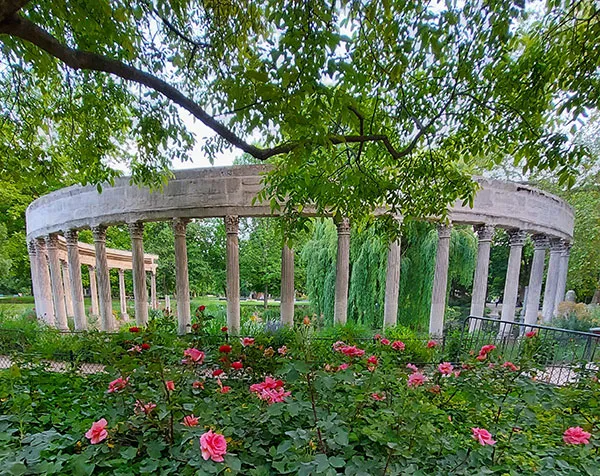 ピアノを弾くショパンの白く美しい彫像で、ショパン・ファンにはおなじみのモンソー公園。凱旋門のあるエトワール広場から地下鉄で3駅、閑静な高級住宅街に位置する。8ヘクタールほどの英国風観賞用庭園。シャルトル公爵、後のフイリップ平等公こと、オルレアン公ルイ・フィリップ2世(1747-1793)が私邸の為に購入し、1773年から1779年にかけて造園。ピラミッドやパゴダ、オランダの風車など、フォリー(装飾用建物)の配置によって独自の理想郷を演出した。大革命時に接収され、1793年に国営化された後、フランス復古王政を経て再びオルレアン家の所有となり、1860年にパリ市が庭園を買収。その一部は新興住宅地建設のため、ユダヤ系資産家・ペレール兄弟Frères Pereireに売却された。周辺には大使館や美術館、高級ホテルが軒を連ね、通りにはベラスケス、レンブラント、ヴァン・ダイク等、17世紀の巨匠の名が付けられている。公園入口のロトンド(ドーム付き円形建物)は、フランス革命期の建築家クロード・ニコラ・ルドゥー Claude-Nicolas Ledoux(1736-1806)による関税徴収所。楕円形の池 Naumachieを囲んでいるコロネード(コリント式の列柱)は1559 年に逝去したアンリ2世への追悼を込めて、妻のカトリーヌ・ド・メディシスがサン=ドニ大聖堂に隣接していたヴァロワ家の埋葬堂、ノートルダム・ド・ラ・ロトンド(ノートルダム・ラ・ブランシュ)に建て加えた記念碑。1719年に破壊されたものが回収され、池の周りに配された。その近くには1871年5月、パリ・コミューンの際に焼失した旧パリ市庁舎のルネサンス式アーケードの一部が設置されている。園内にはフランスを代表する作家ギ・ド・モーパッサンやアルフレッド・ミュッセの彫像があり、モーパッサンを崇拝していた永井荷風も横浜正金銀行リヨン支店員として渡仏した1907(明治40)年に此処を訪れている。また、1786年に徳川家治によって造られ、上野の寛永寺に置かれていた石灯篭が1982年にパリと東京の間で結ばれた友好協定の証としてこの公園内に移送された。