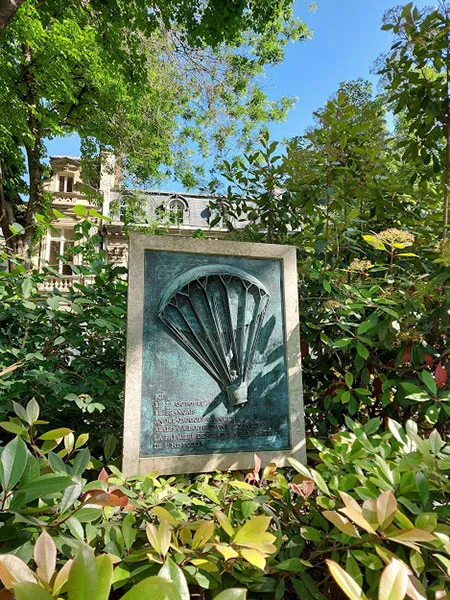 1797年10月22日、発明家アンドレ=ジャック・ガルヌランAndré Jacques GARNERIN (1769-1823)が史上初のパラシュート降下を庭内で成功させた事を記すプレート。