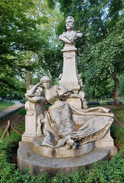 ラウル・ヴェルレ Raoul Verlet(1857-1923)によるギ・ド・モーパッサンGuy de Maupassant(1850-1893)の胸像。1897年に園内に設置された。本を手にしたモニュメントの女性は、1889年に出版された小説『死の如く強し』のヒロインと、この作品に描かれた人生と運命に想いを馳せる女性読者が重ねて表現されている。