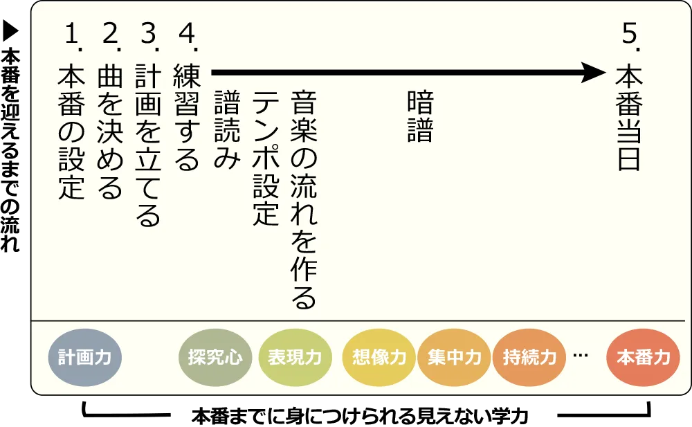 その見えない学力の鍛え方は、実はピアノのレッスンの中に詰まっています。ピアノを弾くには、楽譜を見る、考える、イメージを膨らませる、音を聴く、指を動かす・・・といった様々な力が必要です。それだけでも目、頭、耳、手を使った複合的な力の訓練ができますが、さらにピアノで発表会やコンクール等のステージ経験をすることは、それらの力をより深いところで鍛えることができる他、ある目標に向かって練習計画を立てる「計画力」や、日頃の練習の成果を大事な場面で発揮できる「本番力」を養う絶好の機会となるでしょう。